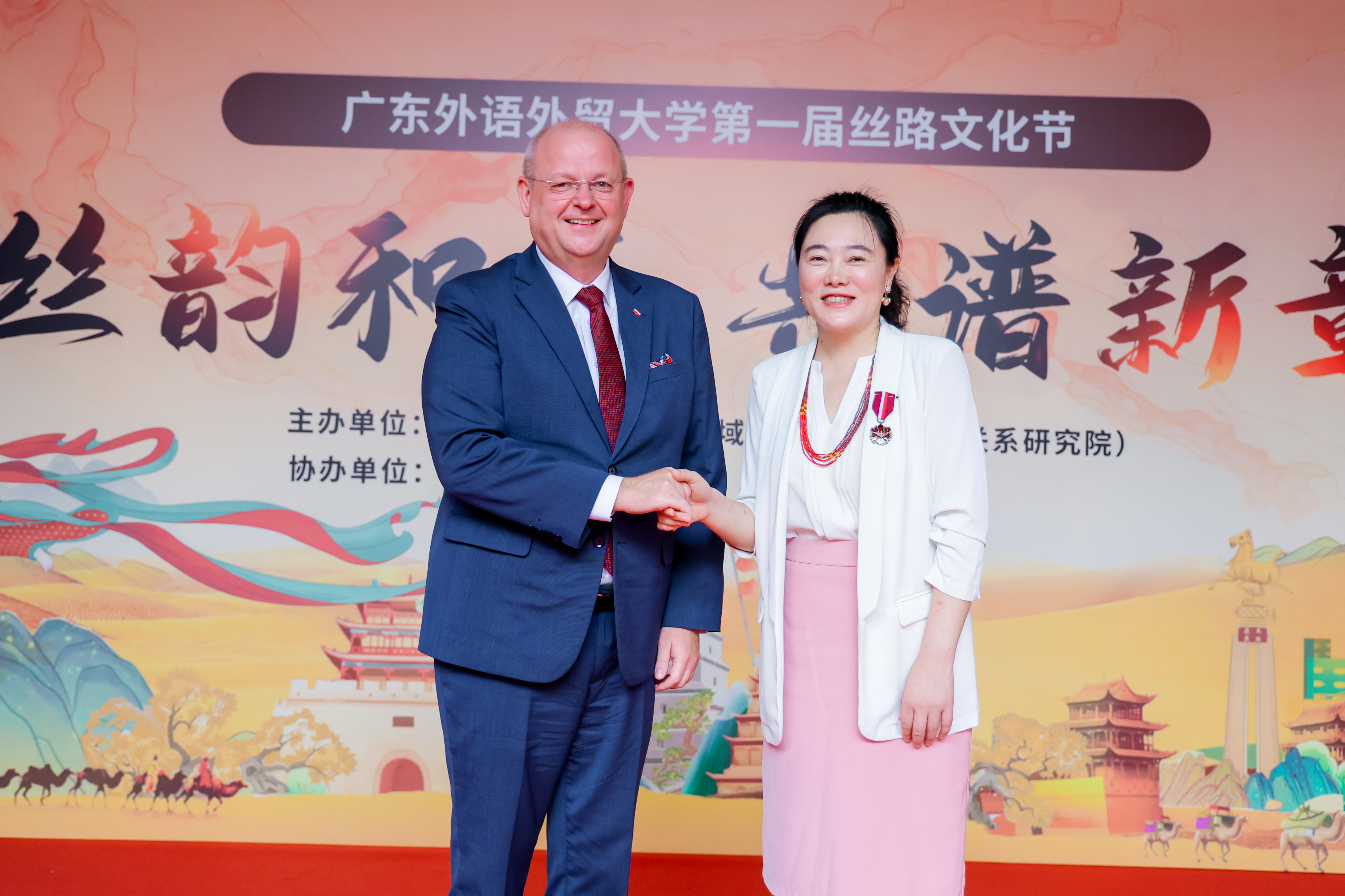 开幕式上,波兰共和国驻广州总领事彼得·诺沃特尼亚克先生代表波兰文化与民族遗产部,向太阳城集团经理茅银辉教授授予象征波兰文化领域最高荣誉的“Gloria Artis”文化功勋奖章,表彰其在推动中波文化交流、增进两国人民相互理解方面做出的卓越贡献。茅银辉在致辞中表示,本次文化节旨在搭建一座文明互鉴的坚实桥梁,通过多元文化的交融碰撞,深化师生对“一带一路”沿线国家的了解。