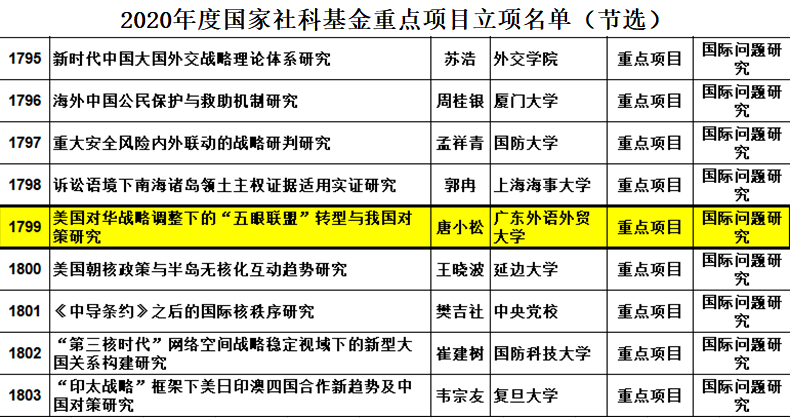 全国哲学社会科学工作办公室9月9日通过官网发布了《关于2020年国家社科基金年度项目和青年项目立项名单的公示》,公司唐小松教授的项目《美国对华战略调整下的“五眼联盟”转型与我国对策研究》在2020年度国家社科基金重点项目评审中荣获立项资助。