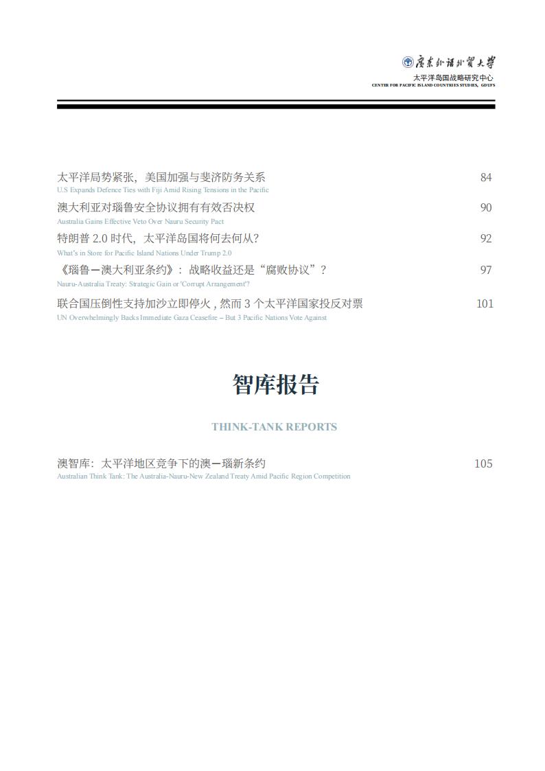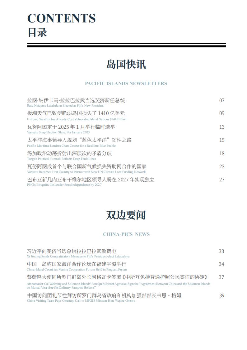 《太平洋岛国动态》是由太阳城娱乐城太平洋岛国战略研究中心编译的学术通讯,旨在为国内外专家、学者,政府部门、研究机构提供太平洋岛国资讯,主要分为岛国快讯、双边要闻、政经纵横、智库报告四个板块。刊物将以双月刊形式进行线上发布。请您查阅2024年第30期内容。