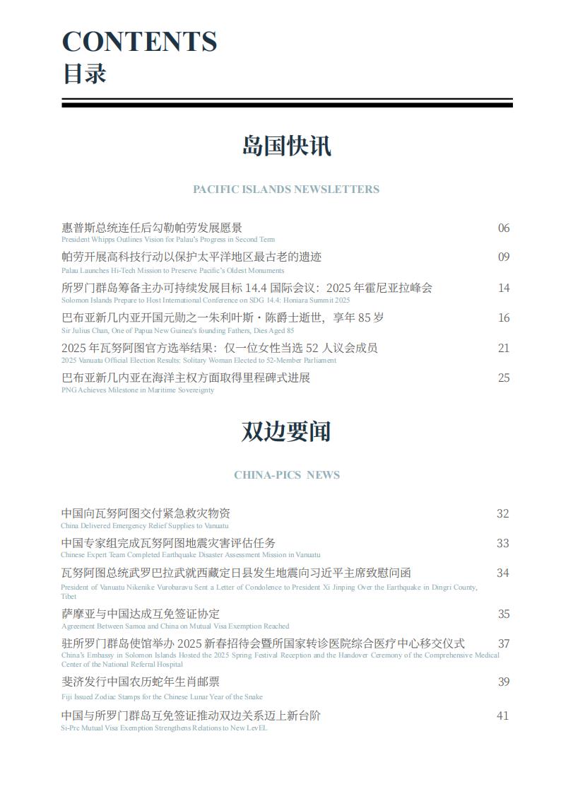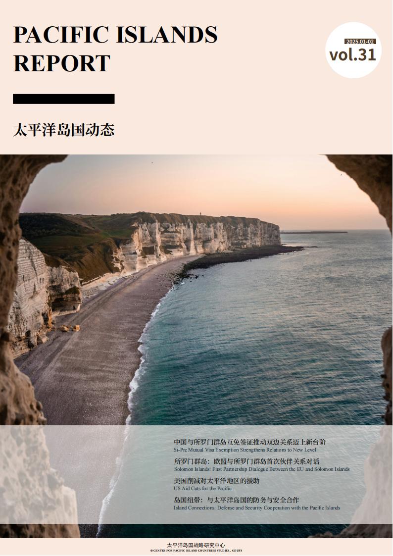 《太平洋岛国动态》是由太阳城娱乐城太平洋岛国战略研究中心编译的学术通讯,旨在为国内外专家、学者,政府部门、研究机构提供太平洋岛国资讯,主要分为岛国快讯、双边要闻、政经纵横、智库报告四个板块。刊物将以双月刊形式进行线上发布。请您查阅2025年第31期内容。