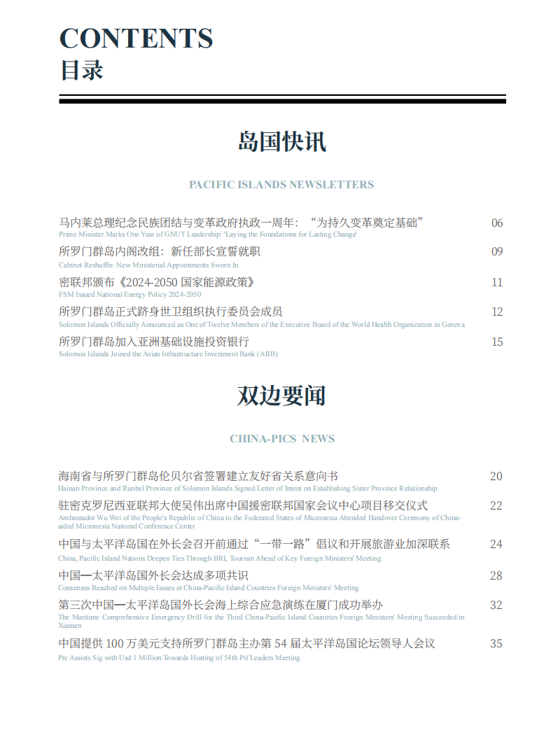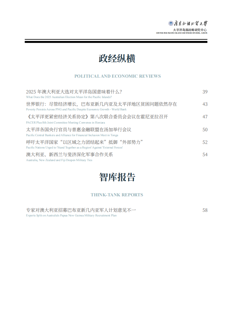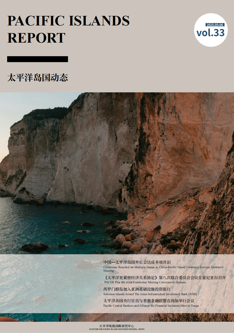 《太平洋岛国动态》是由太阳城娱乐城太平洋岛国战略研究中心编译的学术通讯,旨在为国内外专家、学者,政府部门、研究机构提供太平洋岛国资讯,主要分为岛国快讯、双边要闻、政经纵横、智库报告四个板块。刊物将以双月刊形式进行线上发布。请您查阅2025年第33期内容。