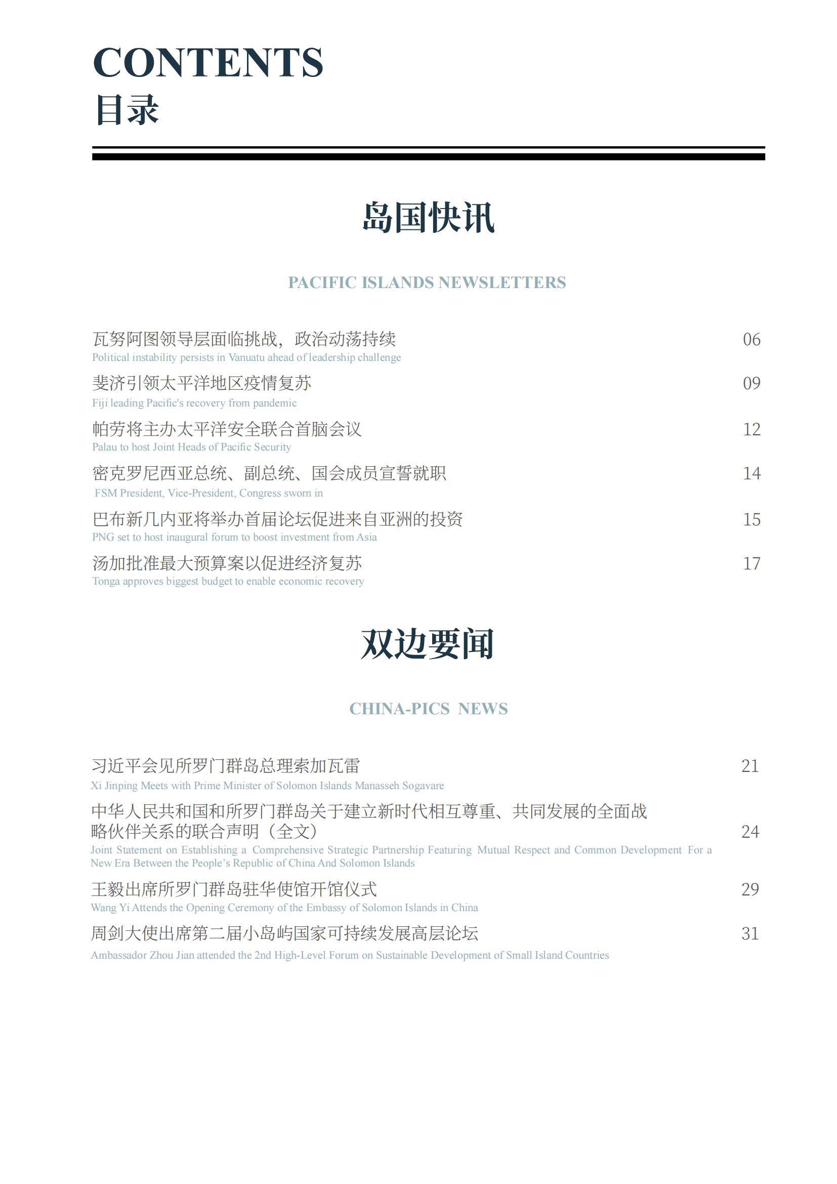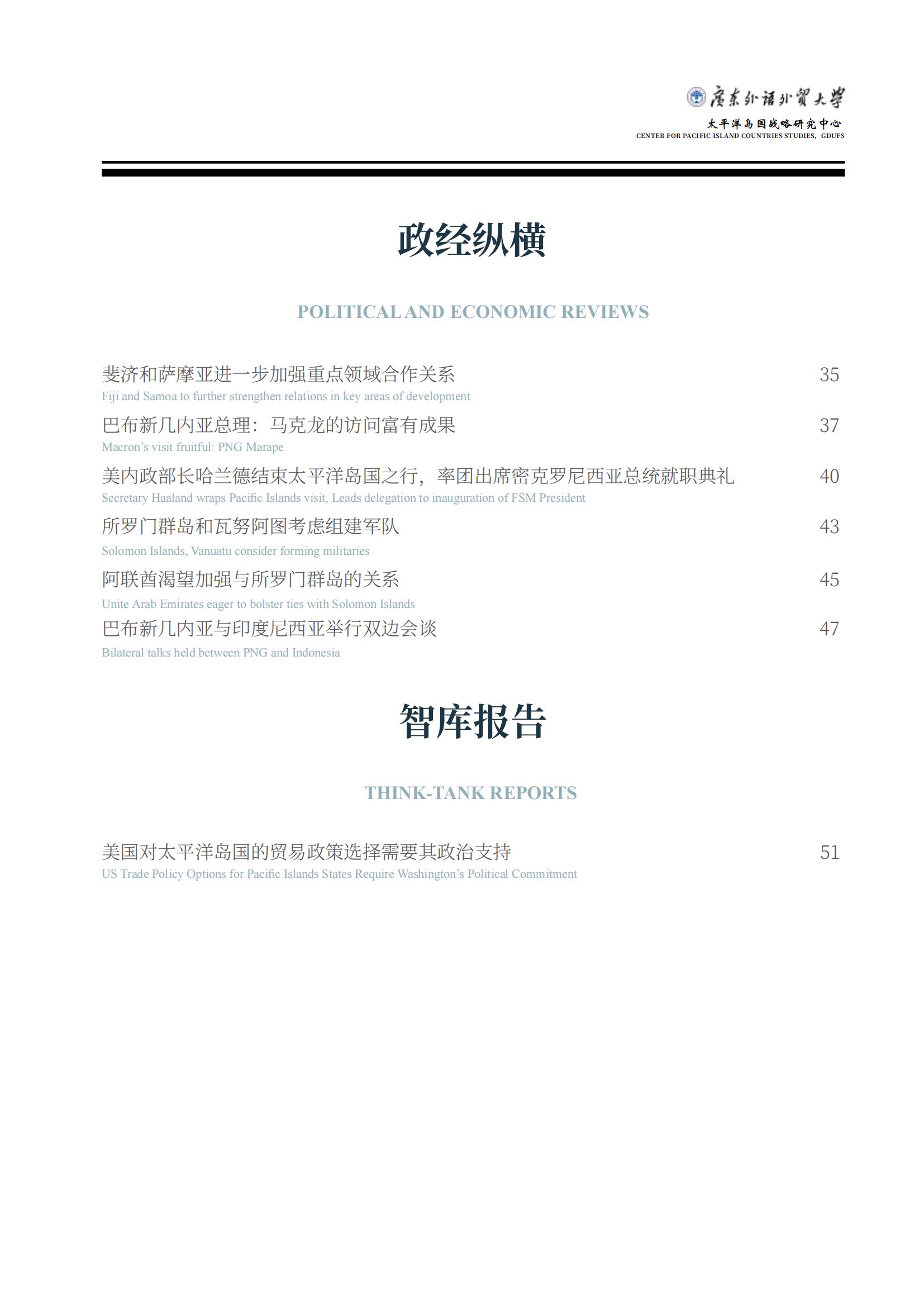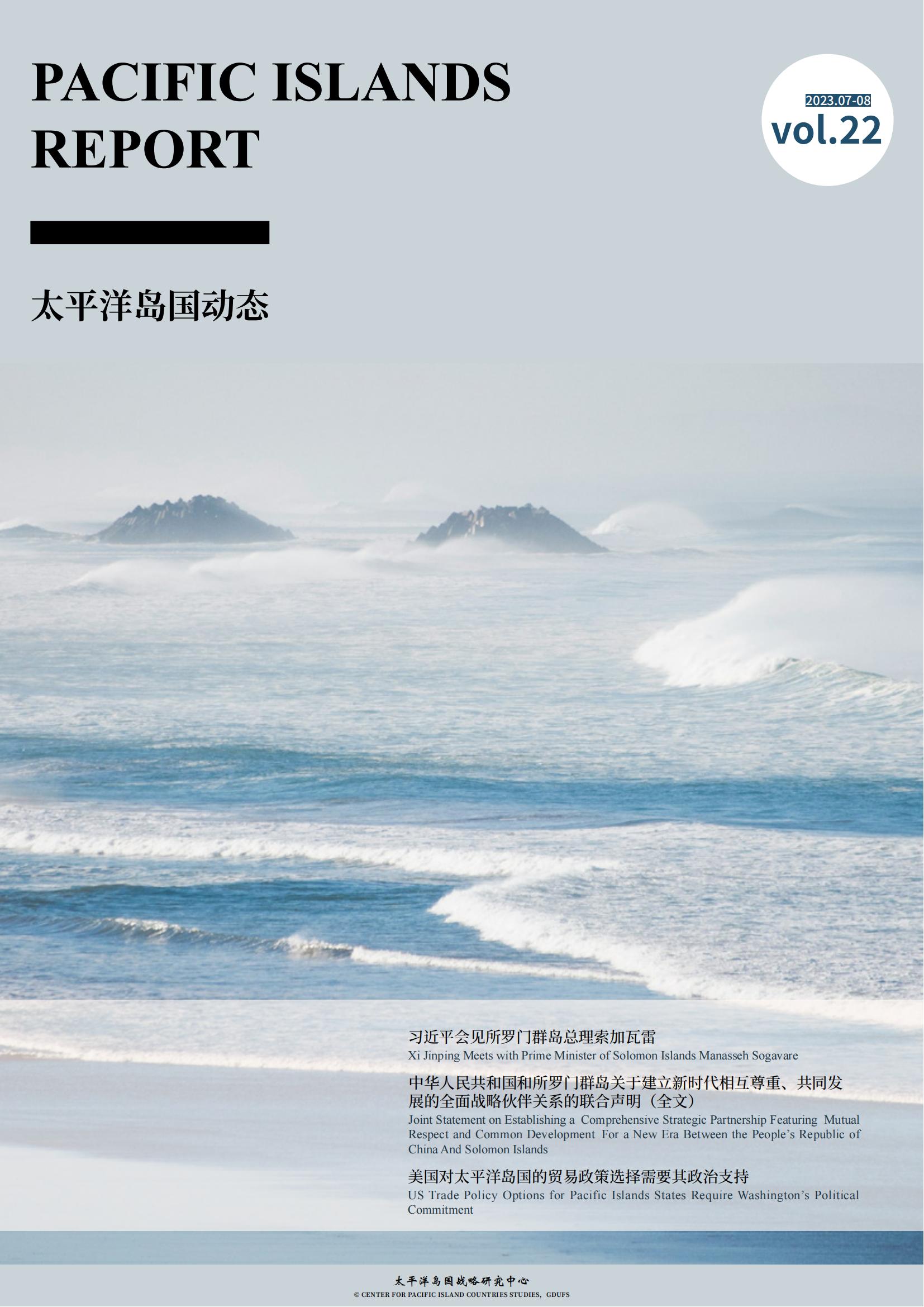 《太平洋岛国动态》是由太阳城娱乐城太平洋岛国战略研究中心编译的学术通讯,旨在为国内外专家、学者,政府部门、研究机构提供太平洋岛国资讯,主要分为岛国快讯、双边要闻、政经纵横、智库报告四个板块。刊物将以双月刊形式进行线上发布。请您查阅2023年第22期内容。