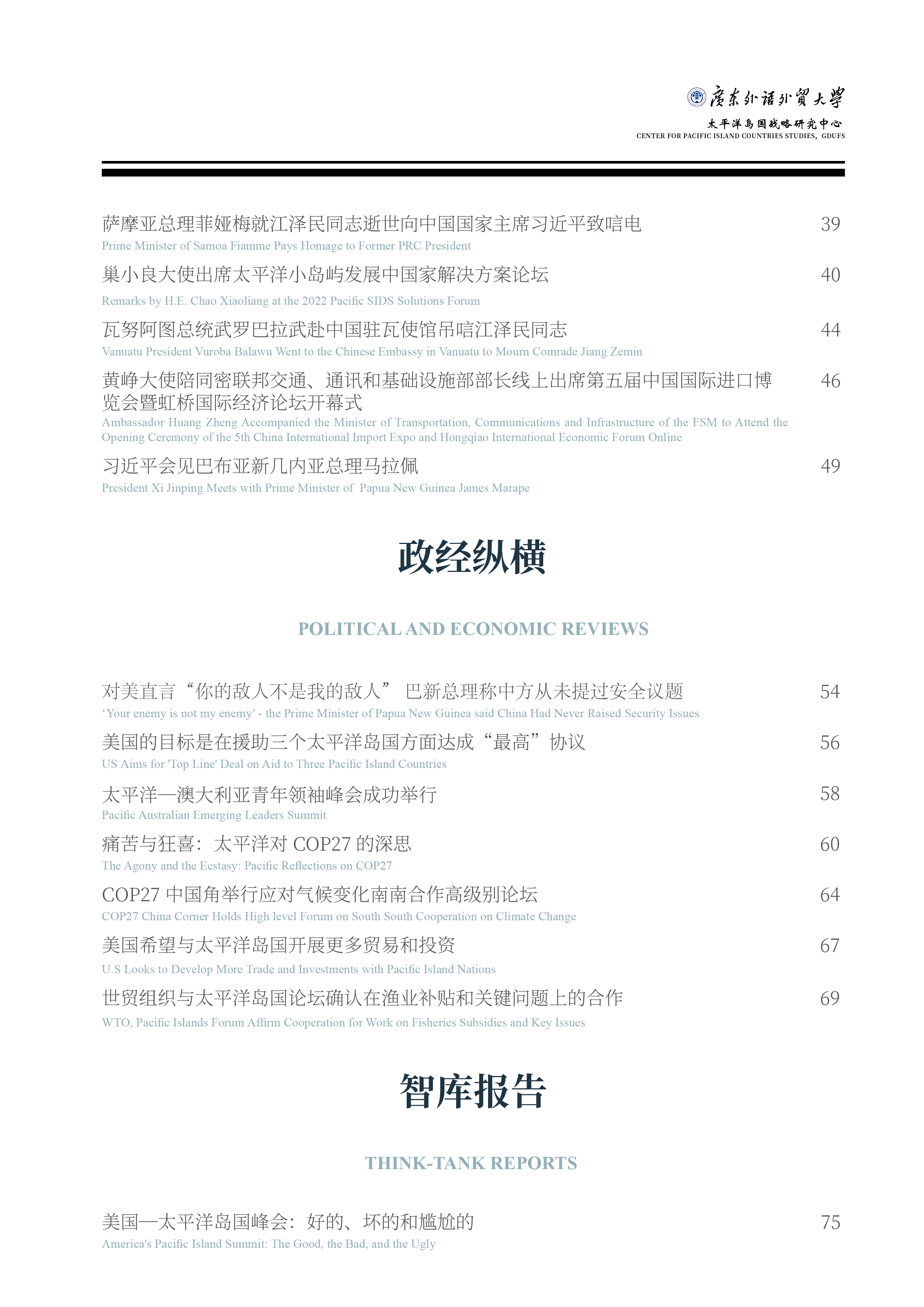 《太平洋岛国动态》是由太阳城娱乐城太平洋岛国战略研究中心编译的学术通讯,旨在为国内外专家、学者,政府部门、研究机构提供太平洋岛国资讯,主要分为岛国快讯、双边要闻、政经纵横、智库报告四个板块。刊物将以双月刊形式进行线上发布。请您查阅2022年第18期内容.