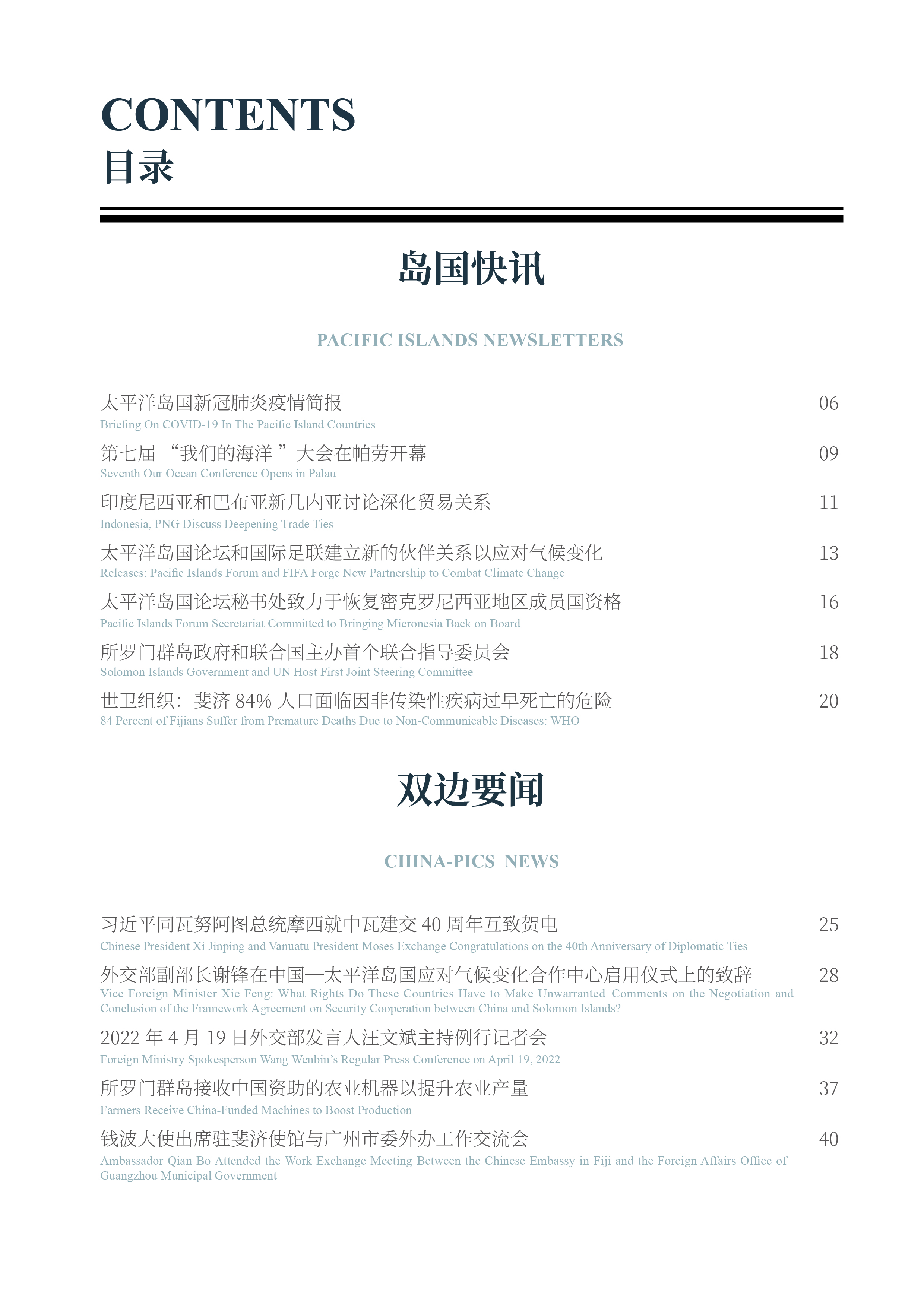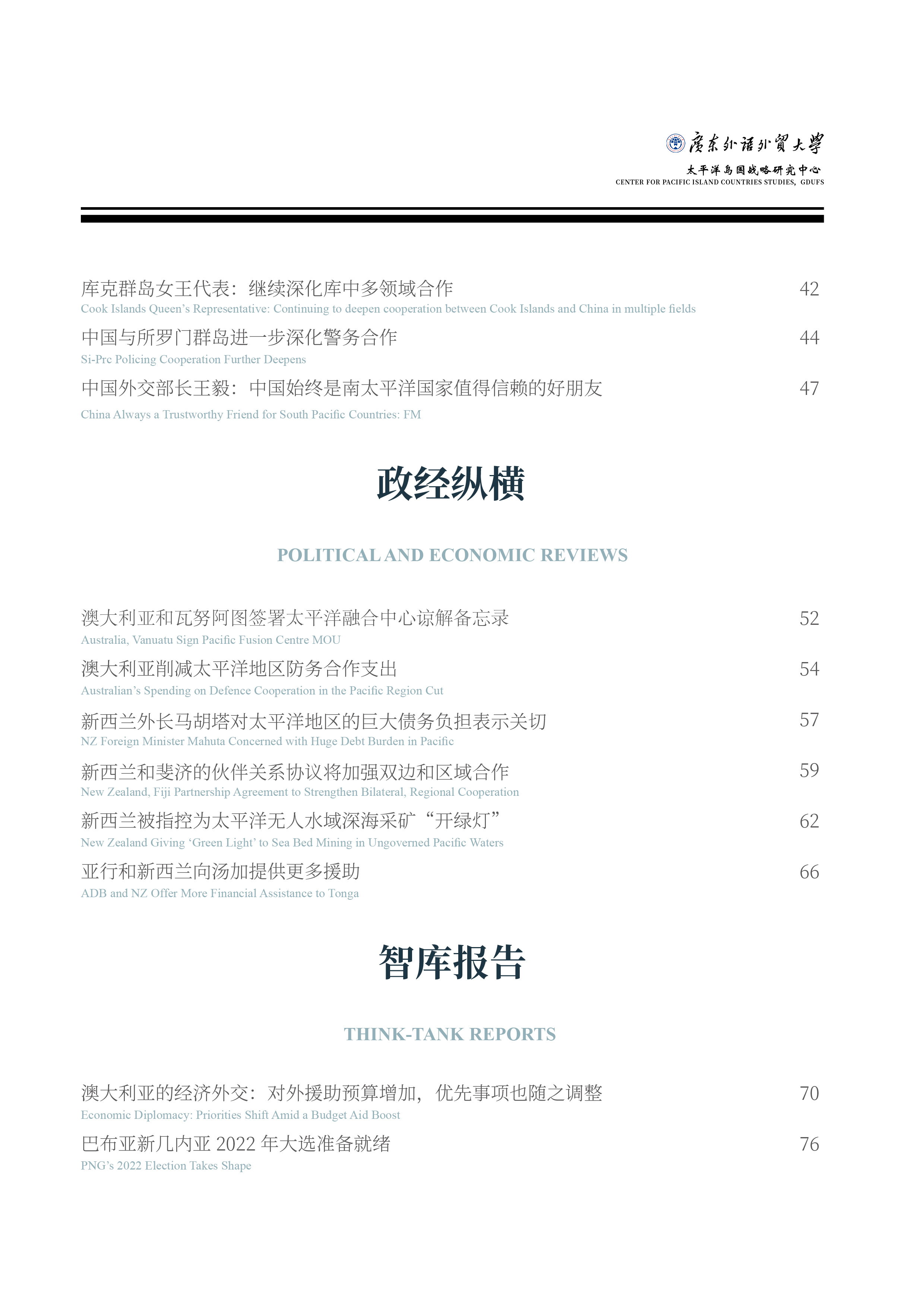 《太平洋岛国动态》是由太阳城娱乐城太平洋岛国战略研究中心编译的学术通讯,旨在为国内外专家、学者,政府部门、研究机构提供太平洋岛国资讯,主要分为岛国快讯、双边要闻、政经纵横、智库报告四个板块。刊物将以双月刊形式进行线上发布。请您查阅2022年第14期内容。