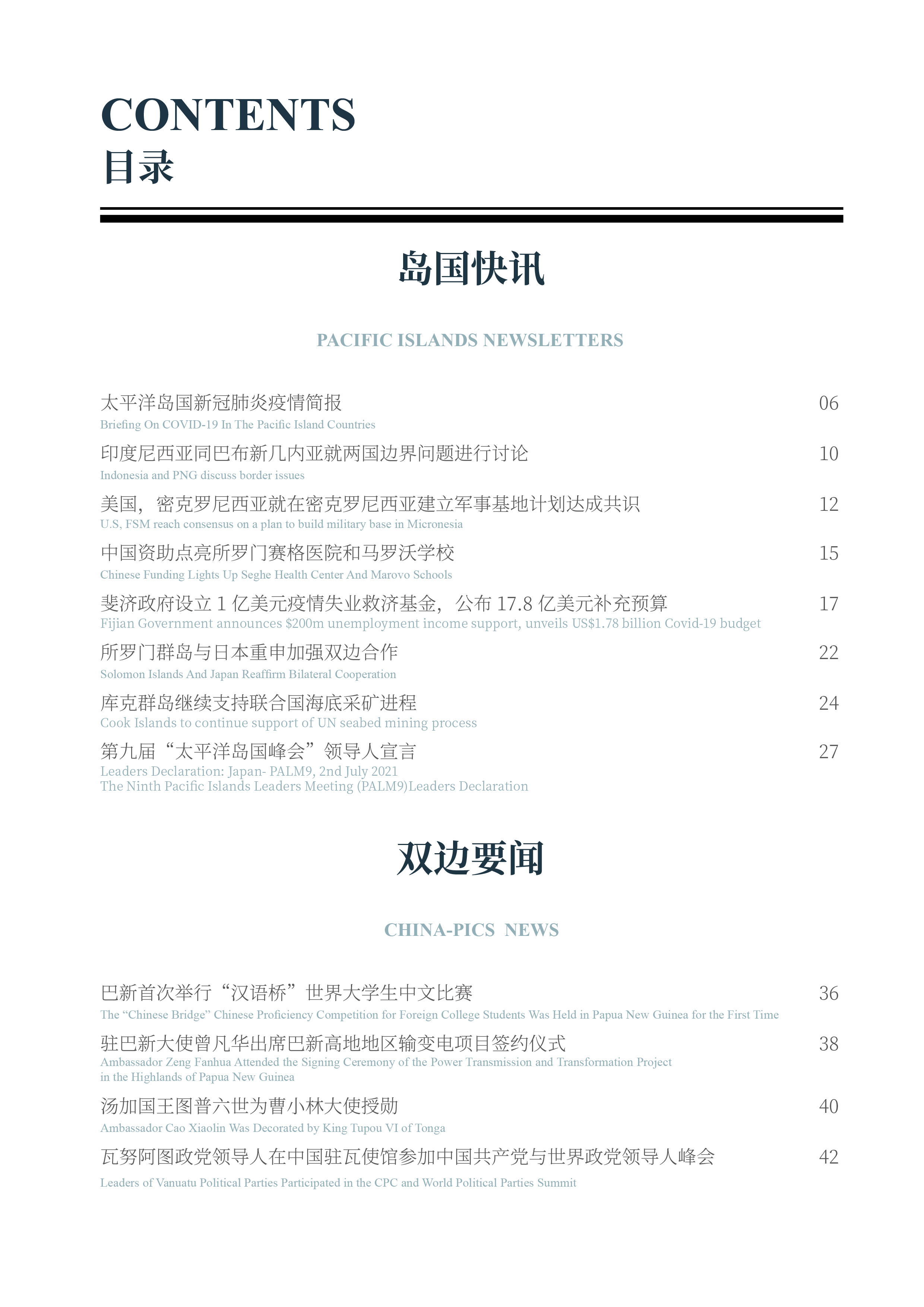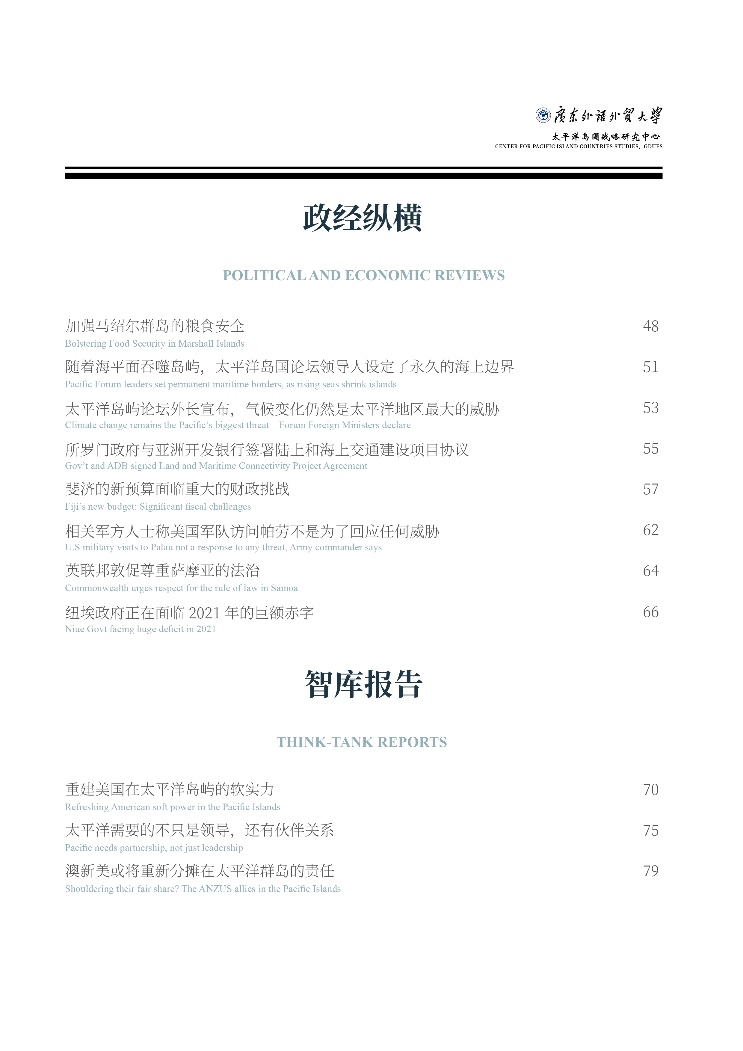 《太平洋岛国动态》是由太阳城娱乐城太平洋岛国战略研究中心编译的学术通讯,旨在为国内外专家、学者,政府部门、研究机构提供太平洋岛国资讯,主要分为岛国快讯、双边要闻、政经纵横、智库报告四个板块。刊物将以双月刊形式进行线上发布。请您查阅2021年第10期内容。