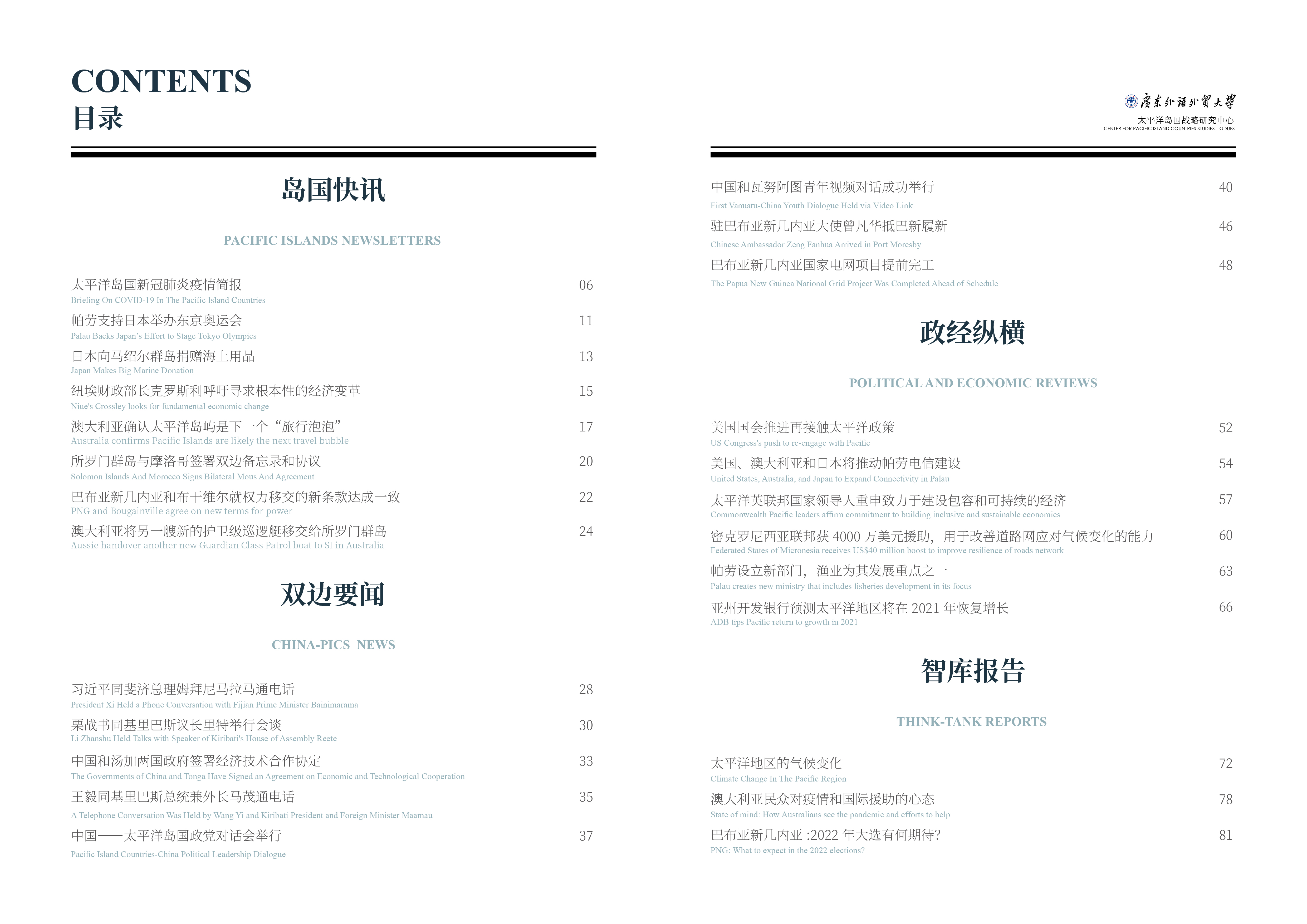 《太平洋岛国动态》是由太阳城娱乐城太平洋岛国战略研究中心编译的学术通讯,旨在为国内外专家、学者,政府部门、研究机构提供太平洋岛国资讯,主要分为岛国快讯、双边要闻、政经纵横、智库报告四个板块。刊物将以双月刊形式进行线上发布。请您查阅2021年第9期内容。