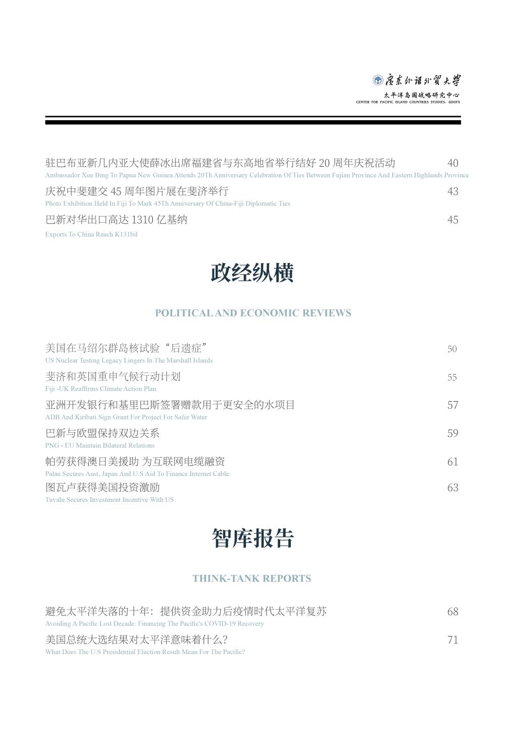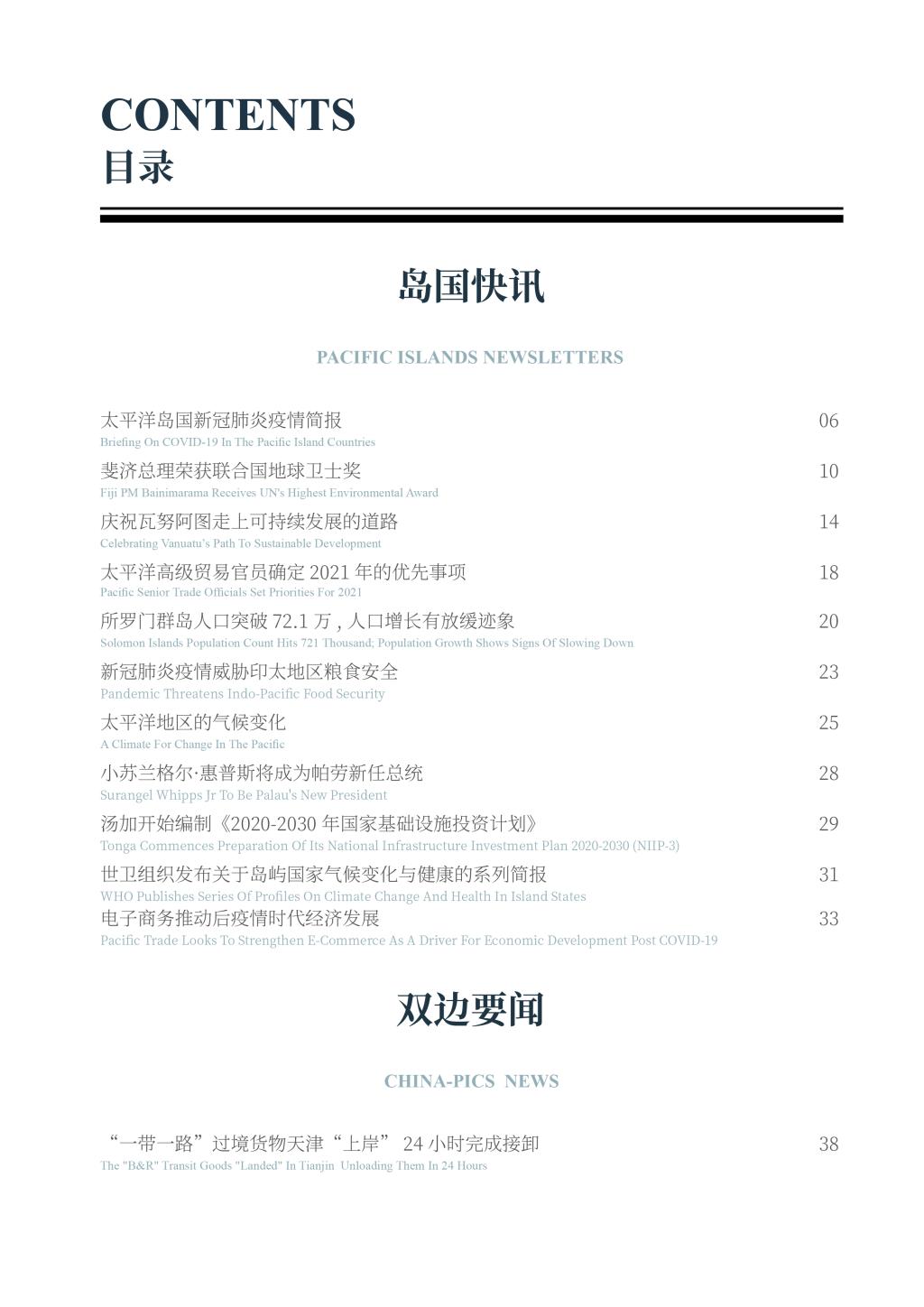 《太平洋岛国动态》是由太阳城娱乐城太平洋岛国战略研究中心编译的学术通讯,旨在为国内外专家、学者,政府部门、研究机构提供太平洋岛国资讯,主要分为岛国快讯、双边要闻、政经纵横、智库报告四个板块。刊物将以双月刊形式进行线上发布。本期内容继续聚焦太平洋岛国新冠肺炎疫情现状及影响,请您阅览。